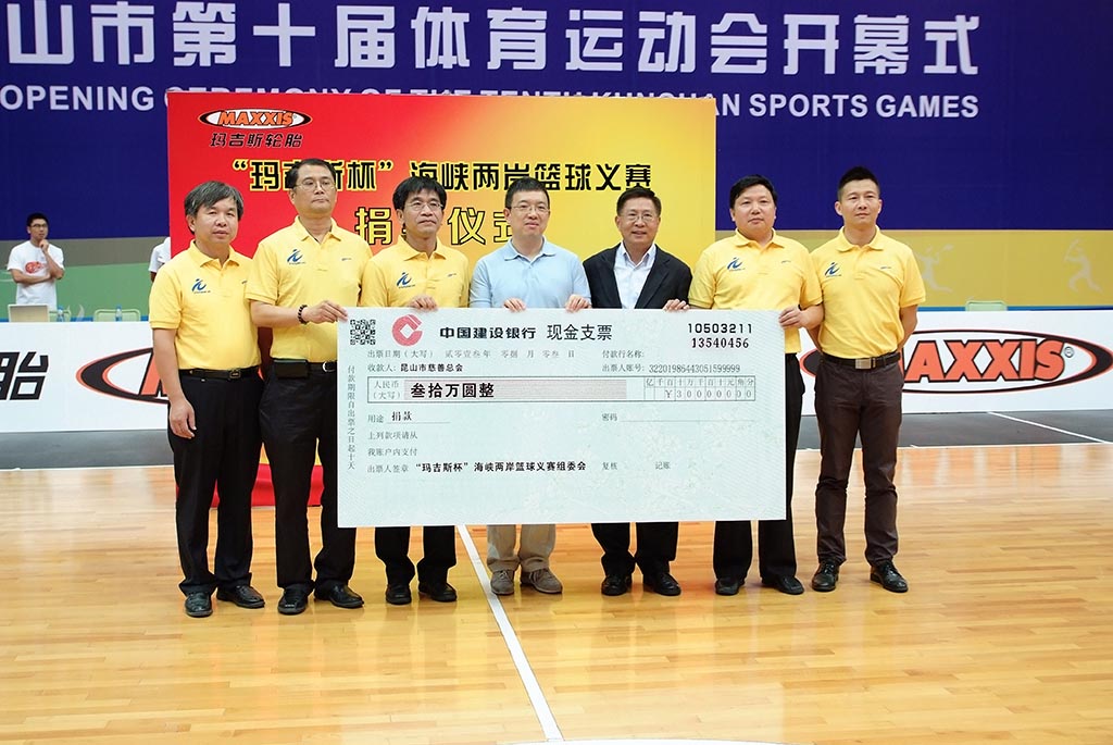 本場比賽不僅是海峽兩岸的一次精彩籃球?qū)Q,更是一次公益盛會,中場環(huán)節(jié),組委會特別安排了公益捐款環(huán)節(jié),作為本次比賽的冠名贊助商,瑪吉斯輪胎代表正新橡膠(中國)有限公司攜手昆山市臺辦、昆山市陸家鎮(zhèn)人民政府、昆山市體育中心發(fā)展有限公司、上?,敿龟牎⑴_灣裕隆納智捷隊向昆山市慈善總會捐贈了本次比賽籌集的三十萬元善款。本次比賽的兩支球隊總經(jīng)理分別致辭,上?,敿鼓谢@總經(jīng)理章明基表示:“十分高興能夠參加本次‘瑪吉斯杯’海峽兩岸籃球義賽,同時也十分榮幸地參與到昆山市第十屆體育運動會的開幕儀式當中,我們與裕隆隊可謂是老朋友了,我們隊中的曾文鼎便出自裕隆。希望大家享受今天的比賽,同時感謝大家對昆山市第十屆體育運動會的支持,以及公益事業(yè)的支持。”裕隆隊總經(jīng)理江育誠則表示,今后希望多參加這樣海峽兩岸的體育、文化交流。隨后此次義賽組委會代表昆山臺協(xié)會副會長游明輝先生向慈善總會轉(zhuǎn)交慈善支票,此時,場下掌聲如雷鳴般響起,將本場比賽的氣氛推向了高潮。